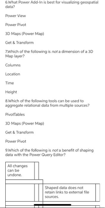 Power View Power Pivot 3D Maps Power Map Get Transform 7Which of the following is not a dimension of a 3D Map layer. What Power Add-In is best for visualizing geospatial data. Which of the following is not a benefit of shaping data with the Power Query Editor.